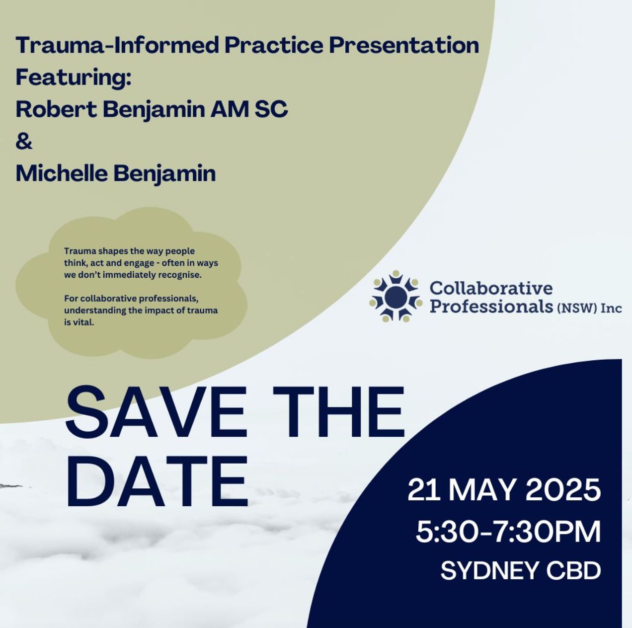 - Collaborative Practice NSW (CPNSW) are hosting an event on 21 May 2025 from 5.30-7.30pm in Sydney called ‘TRAUMA INFORMED PRACTICE PRESENTATION’ featuring, Robert Benjamin AM SC and Michelle Benjamin. This shouldn’t be missed.